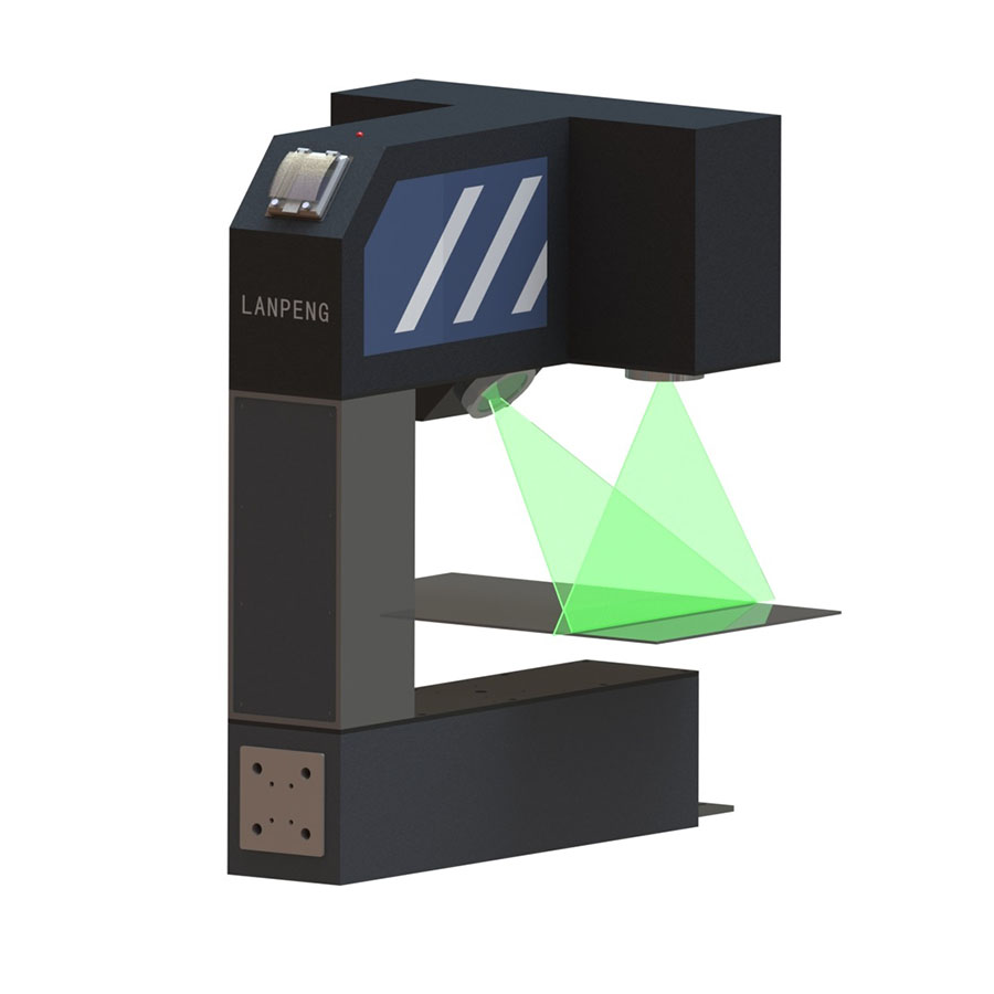 設(shè)備采用工業(yè)相機(jī)測量板材寬度。補(bǔ)光的線性激光垂直設(shè)置,工業(yè)相機(jī)傾斜設(shè)置,用于測量板面呈水平狀態(tài)通過的板材寬度。相機(jī)圖像的長度方向用于測量板材的寬度,圖像的寬度方向用于修正物距(被測物上下波動(dòng)較大時(shí),需增設(shè)激光位移傳感器跟蹤被測物的位置已修正物距)。設(shè)備主要配置上位機(jī)控制系統(tǒng)、外接數(shù)碼管顯示屏,根據(jù)需要可增配嵌入式智能模塊等。設(shè)備下部可配置剪刀叉升降平臺(tái)等輔助設(shè)備。