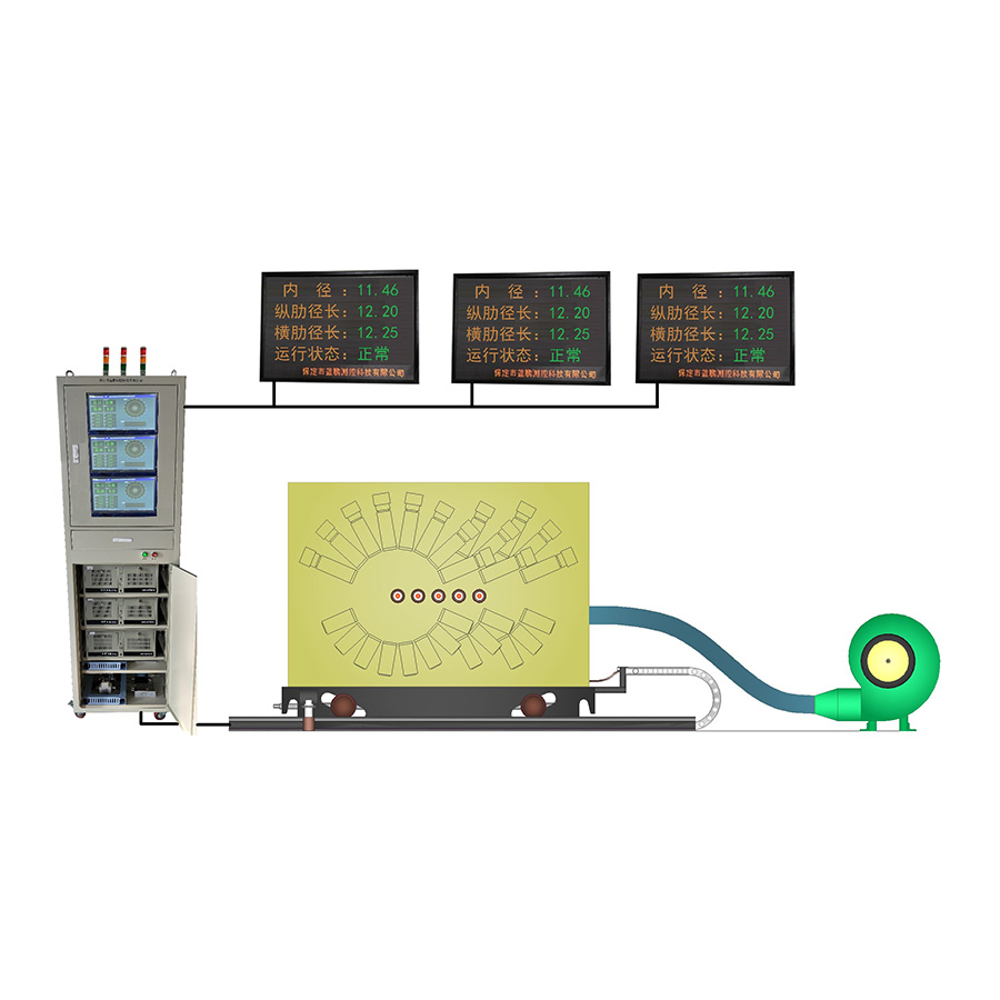 主控室液晶顯示器:管材截面的直徑、平均值、橢圓度;各路測頭的分項測量值;設定的鋼管長度、速度、標稱直徑、上下公差等;尺寸波動趨勢預報(輸入鋼管長度和速度后可以對應外徑在管材的位置),缺陷分析曲線。