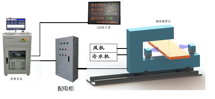 LPBKH200.4型測寬測厚儀主要由兩個點激光位移傳感器、兩個二維激光位移傳感器、水套、主體、外殼、電器柜、冷水機、內循環散熱系統、工控機及電路系統等組成。