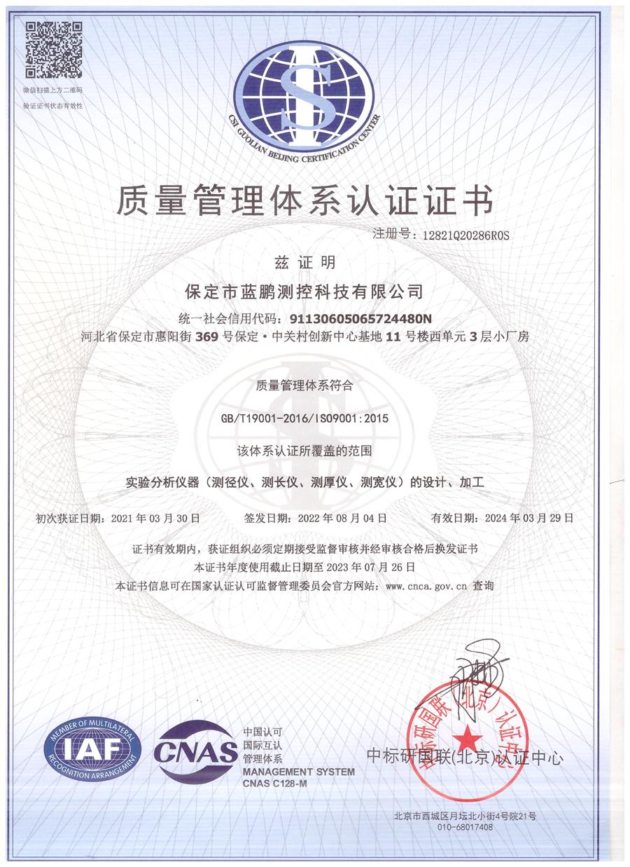 獲得該認證,表明保定市藍鵬測控科技有限公司的質(zhì)量管理體系符合質(zhì)量管理體系及相關(guān)要求,是對公司作為儀器設(shè)計加工商的認可,這有利于進一步提升公司的綜合競爭力,為公司在儀器相關(guān)市場奠定了良好的基礎(chǔ)。