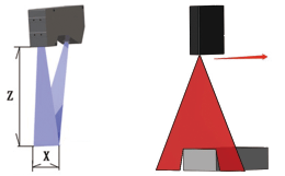 采用激光三角法測量。測量時傳感器發射1束線激光照射被測物的表面,傳感器內的攝像系統拍攝被測物表面線形光斑的圖像。通過分析光斑在攝像系統CCD或CMOS芯片上的位置可得到線形光斑X軸和Z軸的坐標尺寸。