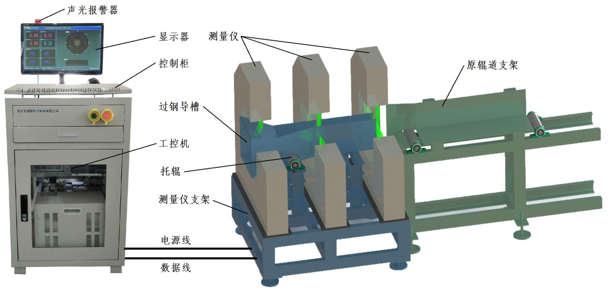 該設(shè)備主要用于測量鋼鐵行業(yè)棒材的直線度,整套系統(tǒng)主要由測量儀、測徑儀支架、托輥、過鋼導(dǎo)槽、控制柜、工控機(jī)、顯示器、LED顯示屏、聲光報(bào)警器等組成。系統(tǒng)組成及測量儀結(jié)構(gòu)見圖5。