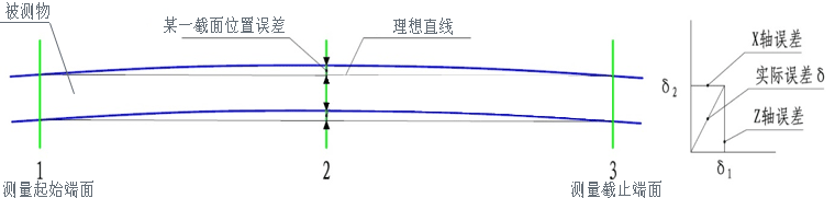 數(shù)據(jù)計(jì)算:在有效的范圍內(nèi)或設(shè)定的范圍內(nèi),取兩端截面的x方向的數(shù)據(jù)做出理想直線,中間的x方向的數(shù)據(jù)與之比計(jì)算出x方向的直線度差異δ1,同理,z方向同樣處理,得到z方向的直線度差異δ2。將δ1和δ2合成計(jì)算,計(jì)算出某一截面的空間位置差異δ。經(jīng)所有采集到的截面的空間位置差異δ做連線,即可還原工件的彎曲情況,得到被測(cè)工件的直線度數(shù)據(jù),見圖3所示。
