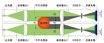 雙測頭由兩組測頭構(gòu)成,兩組測頭以凈間距B平行設(shè)置。當(dāng)被測物通過2束平行光視場時,將在兩個接收鏡頭的CCD芯片上分別形成寬度為L1、L2的陰影。經(jīng)過電路系統(tǒng)處理可得出L1、L2對應(yīng)的尺寸A1、A2,A1、A2再加上B即可得出被測物的尺寸D。