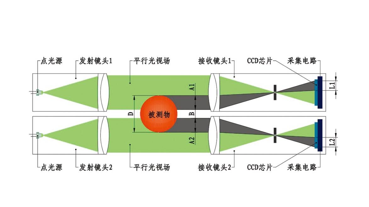 光電測(cè)徑儀采用物方遠(yuǎn)心光路系統(tǒng)和CCD成像法進(jìn)行非接觸尺寸檢測(cè)。其核心部件為遠(yuǎn)心光電測(cè)頭,每組測(cè)頭由發(fā)射鏡頭和接收鏡頭組成。