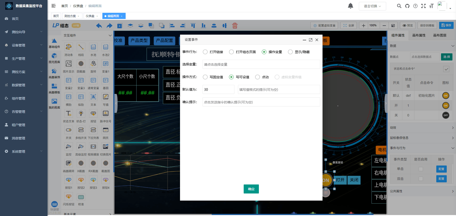lpSCADA 系統在設備控制方面,提供了高度的自定義能力和靈活性。系統支持用戶自定義控制動作,用戶可以根據實際生產需求,定義各種設備的控制動作,如啟動、停止、調整參數等。