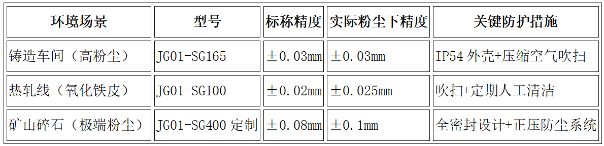 2. 實測效果:防護狀態下,JG01-SG165在鑄造車間的精度保持±0.03mm(與標稱值一致)。