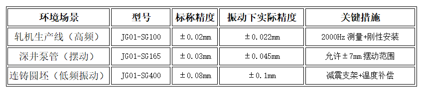 1. 低頻振動(<50Hz):誤差可能增加至標稱值的1.5倍(如JG01-SG165從±0.03mm增至±0.045mm)。