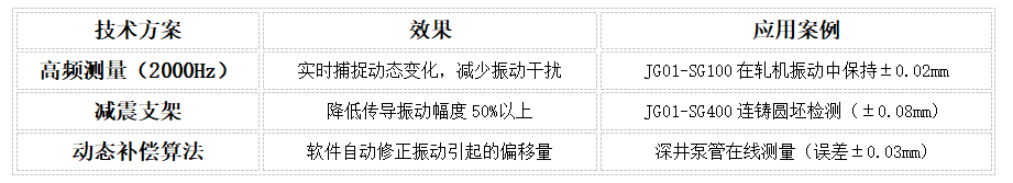 2. 高頻振動(>100Hz):通過2000Hz測量頻率可部分抵消影響,精度波動控制在±10%內(如JG01-SG100保持±0.022mm)。