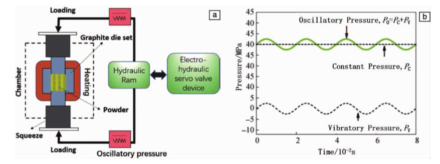 謝志鵬教授課題組提出在粉末燒結過程中引入動態振蕩壓力替代現有的恒定靜態壓力這一全新的設計思想,并在國際上率先研發出一種OPS技術和設備,其基本原理是在一個比較大的恒定壓力作用下,疊加一個頻率和振幅均可調的振蕩壓力,將傳統燒結中施加的“死力”變為“活力”,振蕩壓力耦合裝置和原理示意圖如圖所示。