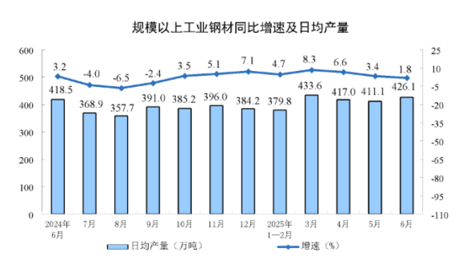 據國家統計局數據顯示:2025年6月份,中國生鐵產量7191萬噸,同比下降4.1%;粗鋼產量8318萬噸,同比下降9.2%;鋼材產量12784萬噸,同比增長1.8%。