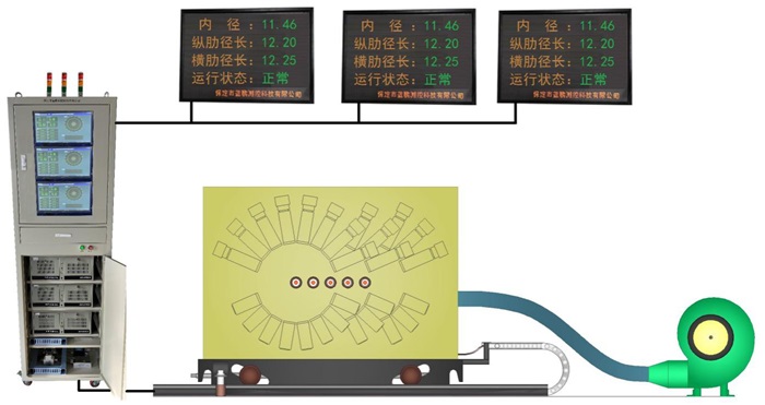 現場LED顯示屏:現場顯示圓鋼測量的直徑、橢圓度、設備運行狀態;顯示螺紋鋼測量的內徑、縱肋高、橫肋高、設備運行狀態。顯示頻率1-3次/秒。