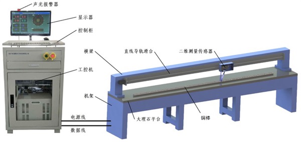 測量儀主要由機架、大理石平臺、橫梁、直線導(dǎo)軌滑臺、二維測量傳感器等組成。檢測時,將銅棒放入二維測量傳感器的測量區(qū),利用直線導(dǎo)軌滑臺帶動二維測量傳感器對銅棒進行全程掃描。掃描結(jié)果通過數(shù)據(jù)線傳輸?shù)娇刂乒駜?nèi)的工控機進行處理、計算,即可得到銅棒的各位置的直線度誤差,選擇誤差的極大值記為該銅棒的直線度誤差。當(dāng)直線度誤差超過設(shè)定的公差范圍時,聲光報警器自動聲光報警,達到合格判定的目的。