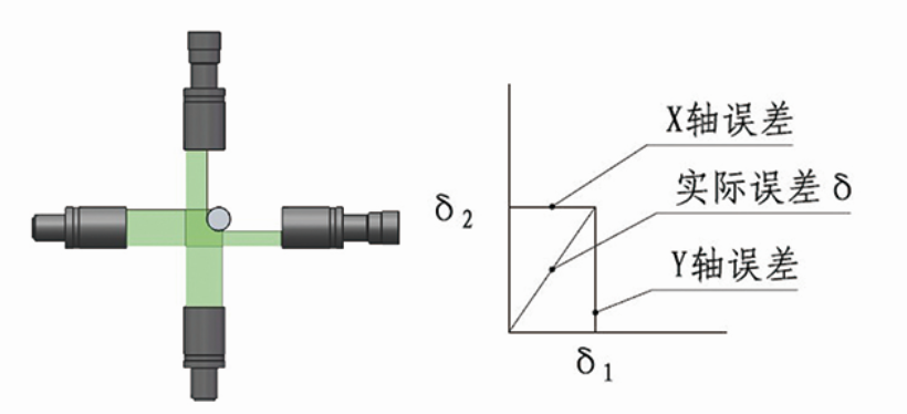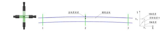 系統根據位置1和位置3采集的X軸方向位置值擬合一條直線,位置2的測量值與該直線的偏差即為位置2在X軸的方向的直線度誤差。同理可得到位置2在Y軸方向的直線度誤差。設X軸的直線度誤差為δ1、Y軸的直線度誤差為δ2、即可計算出棒材直線度的實際誤差δ。