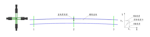 數(shù)據(jù)計算:系統(tǒng)根據(jù)測頭1和測頭3采集的X軸方向位置值擬合一條直線,位置2的測量值與該直線的偏差即為位置2在X軸方向的直線度誤差。同理可得到位置2在Y軸方向的直線度誤差。設(shè)X軸的直線度誤差為δ