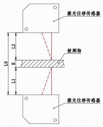 激光測厚儀由上、下兩個對射的激光測頭組成,激光測頭1和激光測頭2以固定間距A相對布置,工作時激光測頭1發(fā)射一束激光照射被測物的下表面,下表面光斑的漫反射光再返回到激光測頭1內的CMOS或CCD芯片上,通過對CMOS或CCD芯片上光斑的位置分析和計算,可以得到激光測頭1到被測物下表面的實際距離B1;同理可以得到激光測頭2到被測物上表面的距離B2。用兩個測頭之間的間距A減去兩個測頭到被測物上下表面的距離B1、B2即可得到被測物的厚度H。