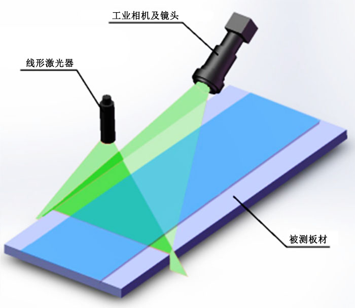 另外還有一種基于機器視覺的測量儀,激光器發出的激光照射在復合板的板面上,且激光的方向與復合板的寬度方向平行。工業相機在復合板上方傾斜一定的角度對準激光帶拍攝圖像,工業相機拍攝的圖像通過數據線傳輸到工控機進行計算,通過計算可以得到如下尺寸數據(以銅鋁復合板為例):(1)下層鋁板的寬度;(2)上層銅板的寬度;(3)鋁板左邊外露尺寸;(4)鋁板右邊外露尺寸。通過對尺寸鋁板左右兩邊外露尺寸的對比即可得到復合板的對稱度。既可檢測寬度又可檢測對稱度。